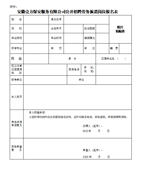 (7)现场填写《安徽壹方保安服务有限公司公开招聘劳务派遣岗位报名表》(见附件);